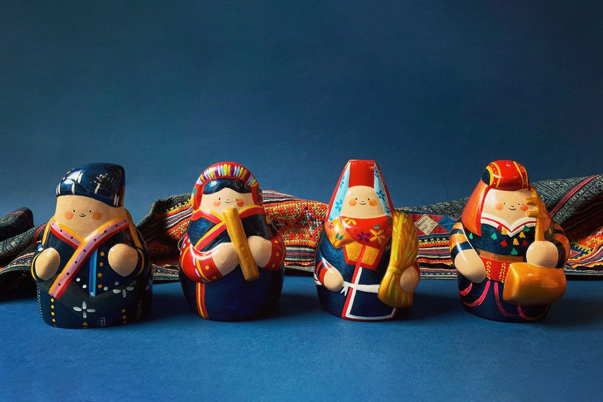 “Em bé trên non” is a lacquerware collection celebrating the pure innocence of childhood in Vietnam’s highlands through portraits of ethnic minority children in their colorful traditional attire. From intricate brocade patterns and vibrant flared skirts to radiant smiles amidst the mountains, each artwork captures not only the splendor of their costumes but also the warmth, sincerity, and rich cultural spirit of life in the highlands.